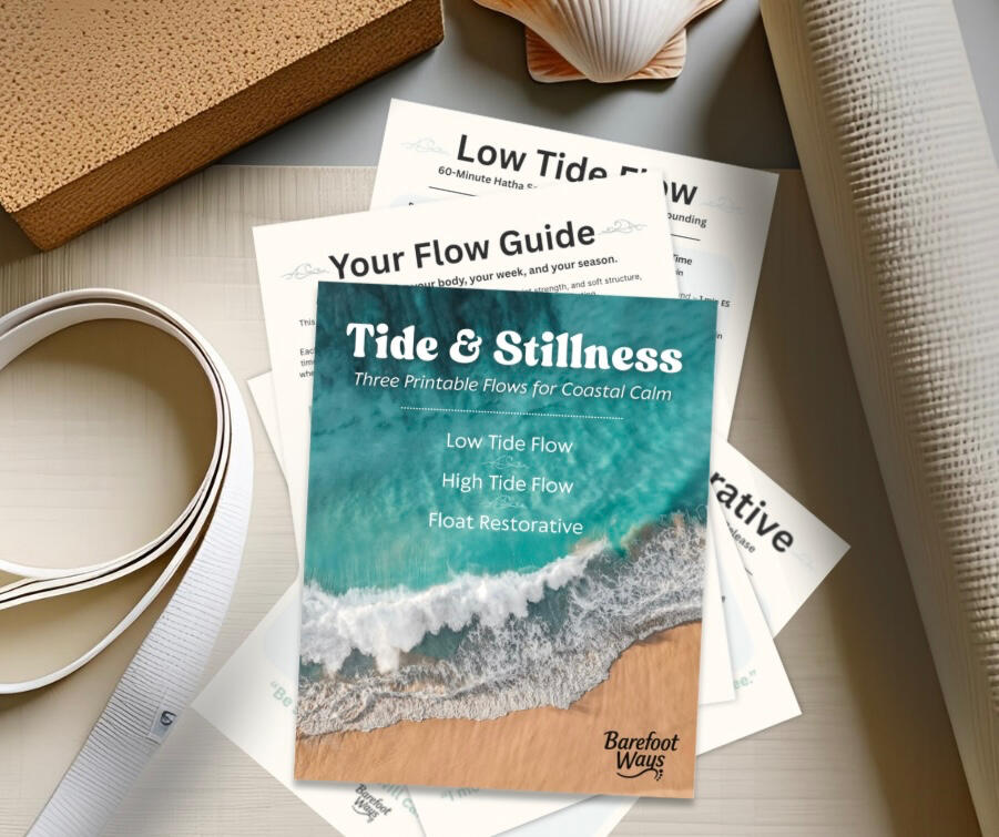 Tide & Stillness is a printable yoga bundle designed to bring coastal calm to your practice. Inside, you'll find three 20 and 60-minute sequences--Low Tide Flow, High Tide Flow, and Float Restorative--each crafted to support different energy states and seasons of life. Whether you're teaching or moving on your own mat, these flows offer structure without rigidity and rhythm without rush.Each class is printable, Spotify-supported, and designed for real-life pacing. A separate Teacher Companion Guide is available as an add-on with cueing tips, pose variations, and class themes for professionals and aspiring guides alike.